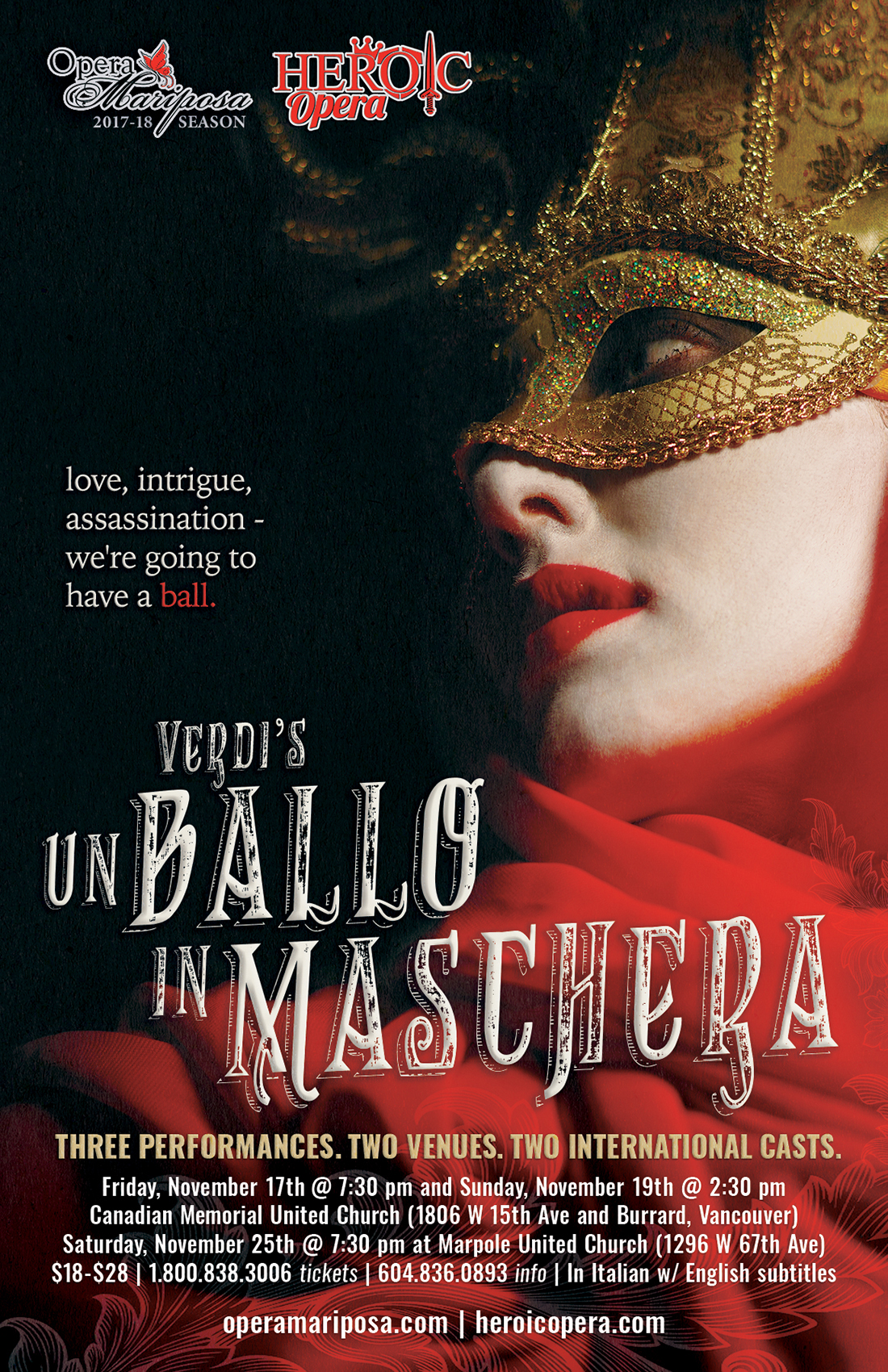 Heroic Opera’s second show is Verdi’s Un Ballo in Maschera, a co-presentation with Opera Mariposa. The opera was presented in full, with lavish costumes, and a double cast of some of Vancouver’s finest singers.