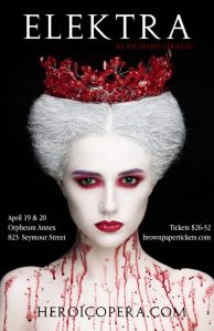 Heroic Opera’s third show is Richard Strauss’ Elektra. The opera was presented in full, in a minimalist setting, and a cast of some of Vancouver’s finest singers.