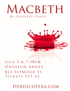Heroic Opera’s fourth mainstage show is Verdi’s epic presentation of Shakespeare’s immortal Macbeth. Presented in full, with lavish costumes, sets, sword fights, blood, guts, and betrayal